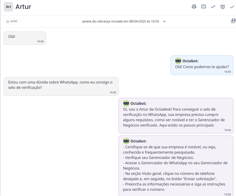 Agora a IA está ainda mais preparada para iniciar conversas com assertividade. A inteligência foi aprimorada para considerar o histórico e o contexto do atendimento logo no primeiro contato, o que torna as respostas mais relevantes desde o início. Com isso, reduzimos a necessidade de acionar um atendente humano e deixamos o fluxo de conversa muito mais natural.