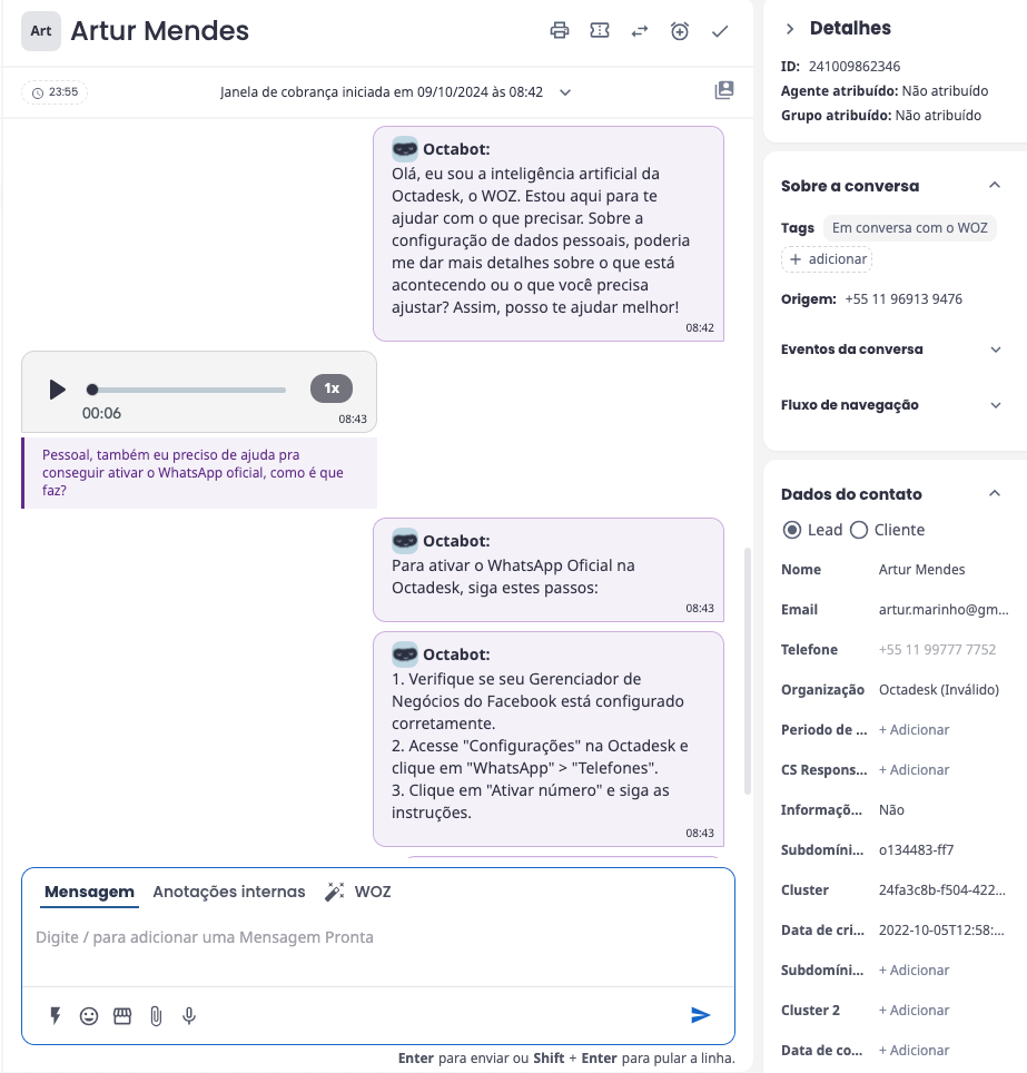 - WOZ Copiloto e créditos zerados: caso seus créditos esgotem, a geração de respostas automáticas através do WOZ ficará indisponível, te ajudando a monitorar e gerenciar melhor o uso dos seus recursos.